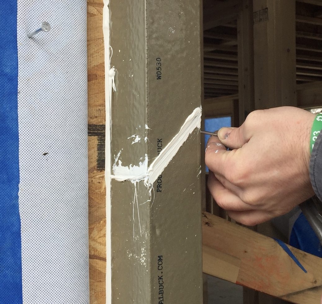 You’ll use three 3/8″ beads on every piece of ThermalBuck, on the mitered ends, and around the perimeter where it meets the sheathing. Also, on the nail flange of the window. In the interior, sealant is needed at the transition of ThermalBuck to the window, and where it meets the framing.